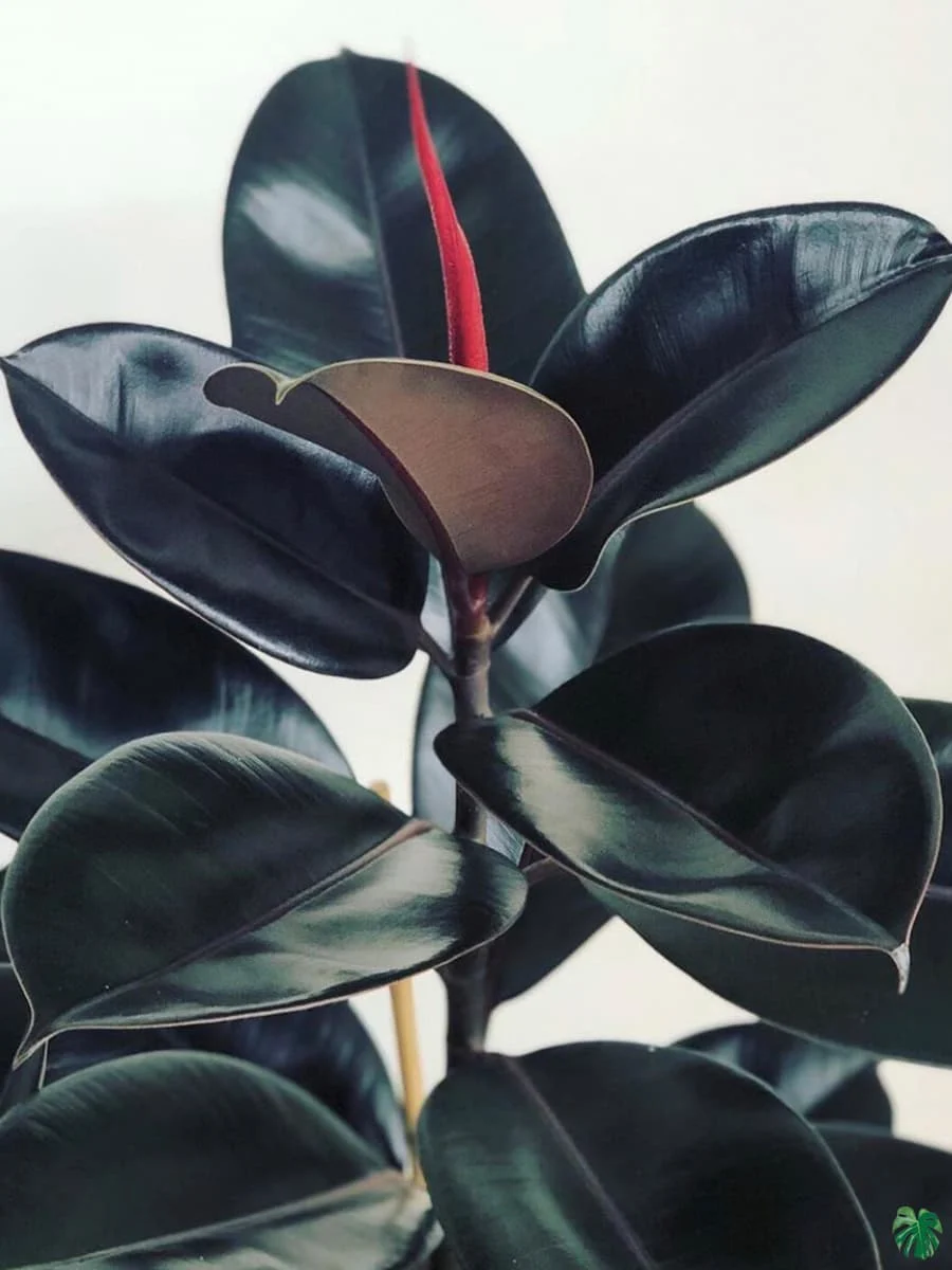 Leaves Thick, leathery, and deep green to black-purple with a glossy finish. New leaves emerge with a red sheath that drops as the leaf unfurls.